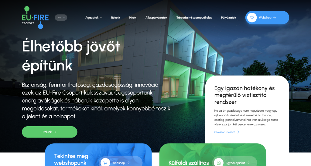 Az eu-fire.hu weboldalt az EU-FIRE Csoport számára készítettük, amely egészségügyi gyártással, ipari fémmegmunkálással és geotermiával foglalkozik, letisztult dizájnnal és átlátható struktúrával mutatva be a cég sokrétű tevékenységeit.