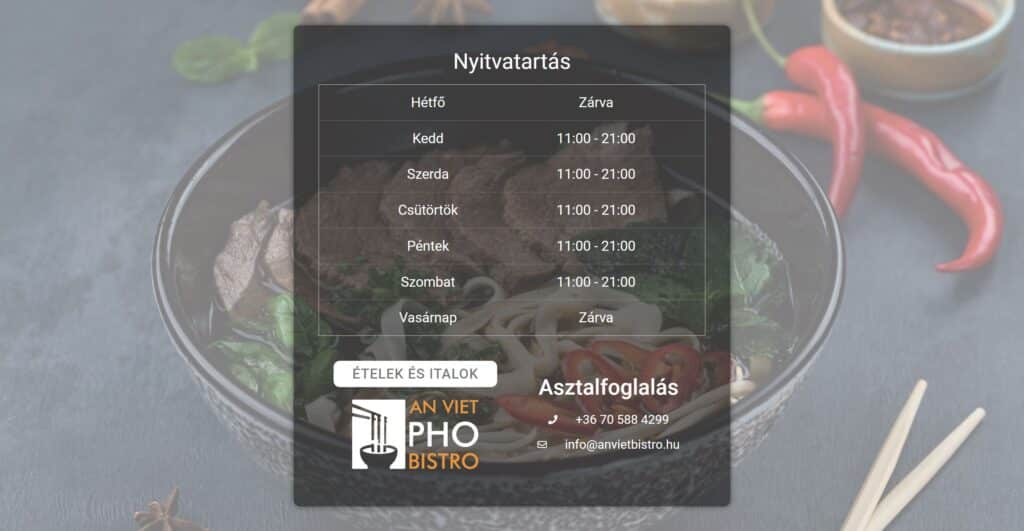 A weboldalt egy autentikus vietnámi bisztró számára készítettük, ahol a friss ételek és a hangulatos atmoszféra modern, felhasználóbarát felületen kerül bemutatásra.